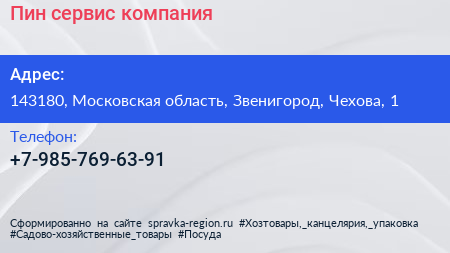 Пин-сервис, компания по адресу 143180, Московская область, Звенигород, Чехова, 1 в дальнейшем Организация, размещена в следующих категориях:
