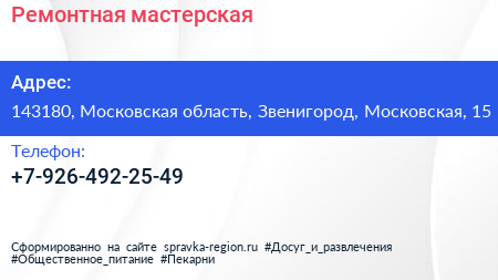 Ремонтная мастерская по адресу 143180, Московская область, Звенигород, Московская, 15 в дальнейшем Организация, размещена в следующих категориях: