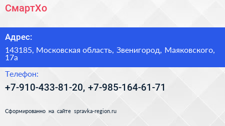 СмартХо по адресу 143185, Московская область, Звенигород, Маяковского, 17а в дальнейшем Организация, размещена в следующих категориях: