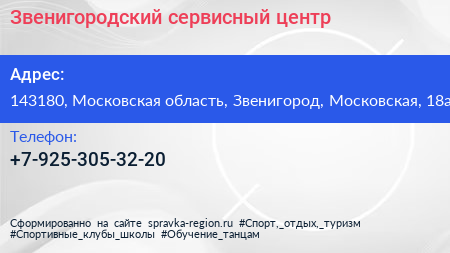 Звенигородский сервисный центр по адресу 143180, Московская область, Звенигород, Московская, 18а в дальнейшем Организация, размещена в следующих категориях: