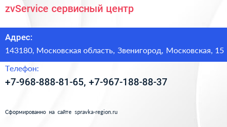 zvService, сервисный центр по адресу 143180, Московская область, Звенигород, Московская, 15 в дальнейшем Организация, размещена в следующих категориях: