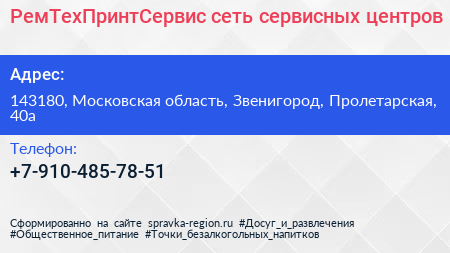 РемТехПринтСервис, сеть сервисных центров по адресу 143180, Московская область, Звенигород, Пролетарская, 40а в дальнейшем Организация, размещена в следующих категориях:
