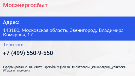 Мосэнергосбыт по адресу 143180, Московская область, Звенигород, Владимира Комарова, 17 в дальнейшем Организация, размещена в следующих категориях:
