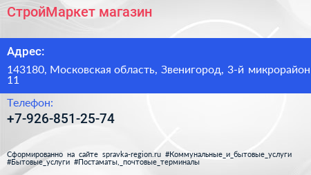 СтройМаркет, магазин по адресу 143180, Московская область, Звенигород, 3-й микрорайон, 11 в дальнейшем Организация, размещена в следующих категориях: