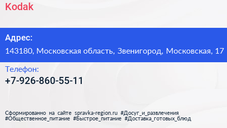Kodak по адресу 143180, Московская область, Звенигород, Московская, 17 в дальнейшем Организация, размещена в следующих категориях: