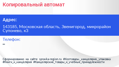 Копировальный автомат по адресу 143185, Московская область, Звенигород, микрорайон Супонево, к3 в дальнейшем Организация, размещена в следующих категориях: