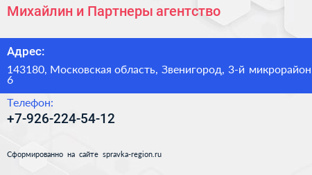 Михайлин и Партнеры, агентство по адресу 143180, Московская область, Звенигород, 3-й микрорайон, 6 в дальнейшем Организация, размещена в следующих категориях: