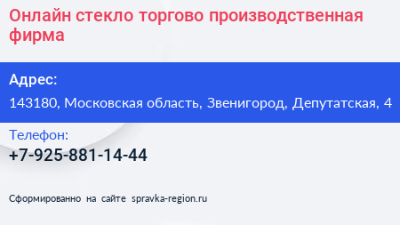 Онлайн стекло, торгово-производственная фирма по адресу 143180, Московская область, Звенигород, Депутатская, 4 в дальнейшем Организация, размещена в следующих категориях: