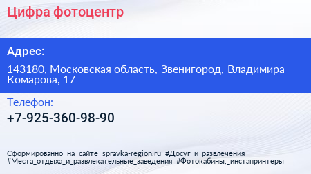 Цифра, фотоцентр по адресу 143180, Московская область, Звенигород, Владимира Комарова, 17 в дальнейшем Организация, размещена в следующих категориях: