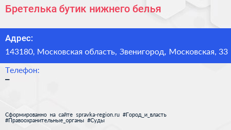 Бретелька, бутик нижнего белья по адресу 143180, Московская область, Звенигород, Московская, 33 в дальнейшем Организация, размещена в следующих категориях: