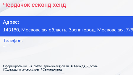 Чердачок, секонд-хенд по адресу 143180, Московская область, Звенигород, Московская, 7/9 в дальнейшем Организация, размещена в следующих категориях: