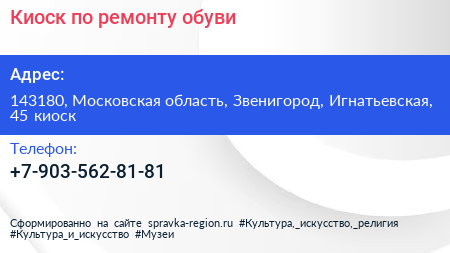 Киоск по ремонту обуви по адресу 143180, Московская область, Звенигород, Игнатьевская, 45 киоск в дальнейшем Организация, размещена в следующих категориях: