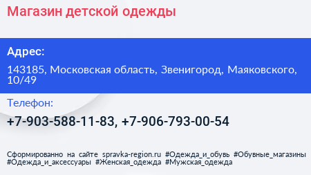Магазин детской одежды по адресу 143185, Московская область, Звенигород, Маяковского, 10/49 в дальнейшем Организация, размещена в следующих категориях: