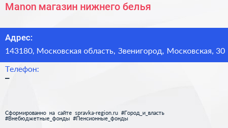 Manon, магазин нижнего белья по адресу 143180, Московская область, Звенигород, Московская, 30 в дальнейшем Организация, размещена в следующих категориях: