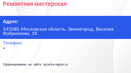 Ремонтная мастерская по адресу 143180, Московская область, Звенигород, Василия Фабричнова, 18 в дальнейшем Организация, размещена в следующих категориях: