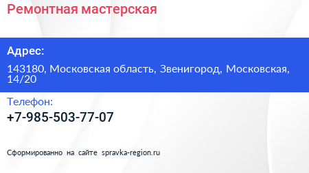 Ремонтная мастерская по адресу 143180, Московская область, Звенигород, Московская, 14/20 в дальнейшем Организация, размещена в следующих категориях: