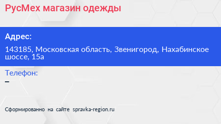 РусМех, магазин одежды по адресу 143185, Московская область, Звенигород, Нахабинское шоссе, 15а в дальнейшем Организация, размещена в следующих категориях: