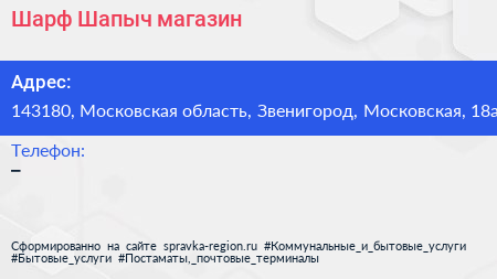 Шарф Шапыч, магазин по адресу 143180, Московская область, Звенигород, Московская, 18а в дальнейшем Организация, размещена в следующих категориях: