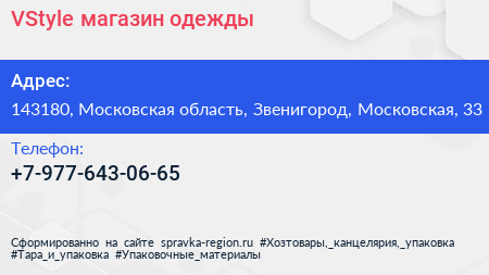VStyle, магазин одежды по адресу 143180, Московская область, Звенигород, Московская, 33 в дальнейшем Организация, размещена в следующих категориях: