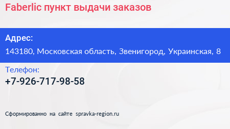 Faberlic, пункт выдачи заказов по адресу 143180, Московская область, Звенигород, Украинская, 8 в дальнейшем Организация, размещена в следующих категориях: