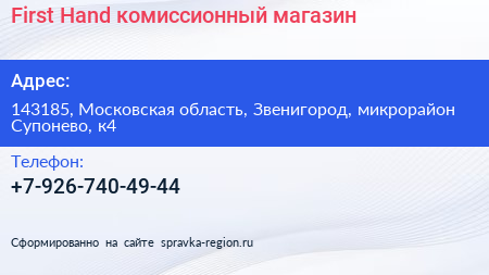 First Hand, комиссионный магазин по адресу 143185, Московская область, Звенигород, микрорайон Супонево, к4 в дальнейшем Организация, размещена в следующих категориях: