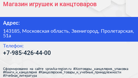 Магазин игрушек и канцтоваров по адресу 143185, Московская область, Звенигород, Пролетарская, 51а в дальнейшем Организация, размещена в следующих категориях: