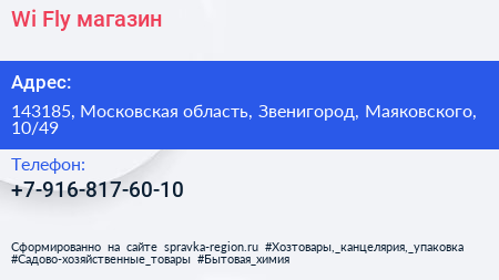 Wi Fly, магазин по адресу 143185, Московская область, Звенигород, Маяковского, 10/49 в дальнейшем Организация, размещена в следующих категориях: