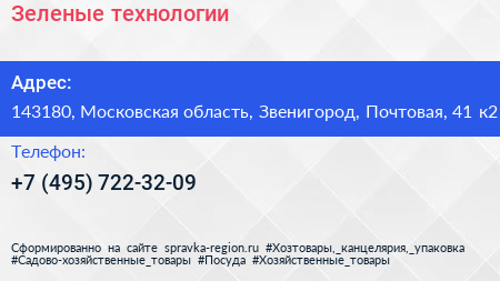 Зеленые технологии по адресу 143180, Московская область, Звенигород, Почтовая, 41 к2 в дальнейшем Организация, размещена в следующих категориях: