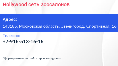 Hollywood, сеть зоосалонов по адресу 143185, Московская область, Звенигород, Спортивная, 16 в дальнейшем Организация, размещена в следующих категориях: