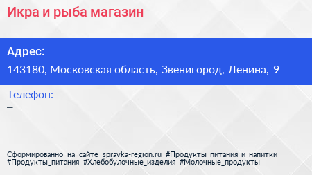 Икра и рыба, магазин по адресу 143180, Московская область, Звенигород, Ленина, 9 в дальнейшем Организация, размещена в следующих категориях: