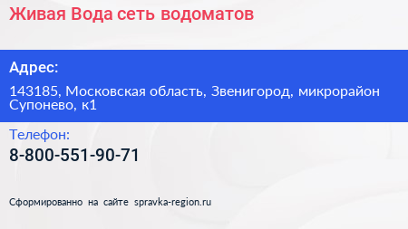 Живая Вода, сеть водоматов по адресу 143185, Московская область, Звенигород, микрорайон Супонево, к1 в дальнейшем Организация, размещена в следующих категориях: