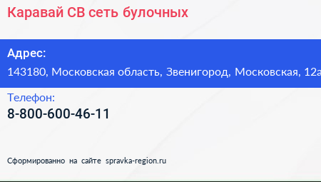 Каравай СВ, сеть булочных по адресу 143180, Московская область, Звенигород, Московская, 12а в дальнейшем Организация, размещена в следующих категориях: