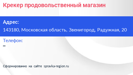Крекер, продовольственный магазин по адресу 143180, Московская область, Звенигород, Радужная, 20 в дальнейшем Организация, размещена в следующих категориях: