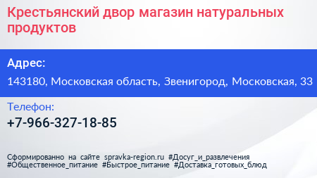 Крестьянский двор, магазин натуральных продуктов по адресу 143180, Московская область, Звенигород, Московская, 33 в дальнейшем Организация, размещена в следующих категориях: