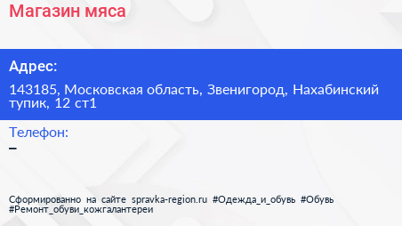 Магазин мяса по адресу 143185, Московская область, Звенигород, Нахабинский тупик, 12 ст1 в дальнейшем Организация, размещена в следующих категориях: