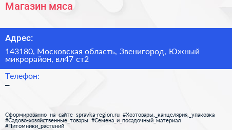 Магазин мяса по адресу 143180, Московская область, Звенигород, Южный микрорайон, вл47 ст2 в дальнейшем Организация, размещена в следующих категориях: