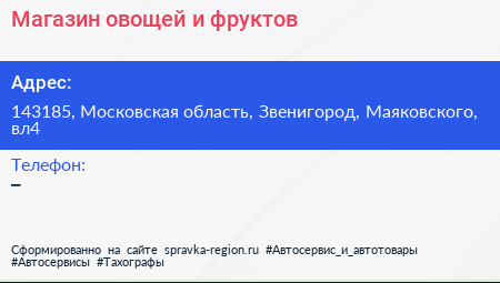 Магазин овощей и фруктов по адресу 143185, Московская область, Звенигород, Маяковского, вл4 в дальнейшем Организация, размещена в следующих категориях: