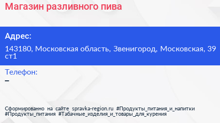 Магазин разливного пива по адресу 143180, Московская область, Звенигород, Московская, 39 ст1 в дальнейшем Организация, размещена в следующих категориях: