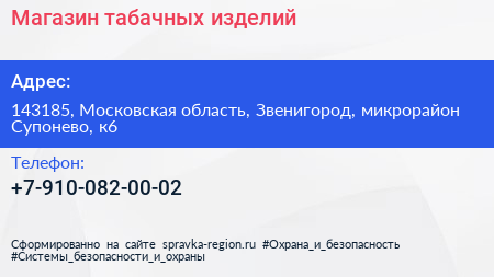 Магазин табачных изделий по адресу 143185, Московская область, Звенигород, микрорайон Супонево, к6 в дальнейшем Организация, размещена в следующих категориях: