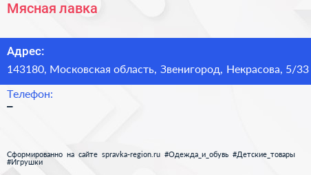 Мясная лавка по адресу 143180, Московская область, Звенигород, Некрасова, 5/33 в дальнейшем Организация, размещена в следующих категориях: