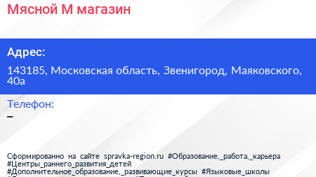 Мясной М., магазин по адресу 143185, Московская область, Звенигород, Маяковского, 40а в дальнейшем Организация, размещена в следующих категориях: