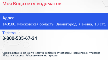 Моя Вода, сеть водоматов по адресу 143180, Московская область, Звенигород, Ленина, 13 ст1 в дальнейшем Организация, размещена в следующих категориях: