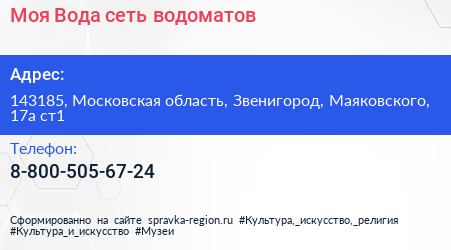 Моя Вода, сеть водоматов по адресу 143185, Московская область, Звенигород, Маяковского, 17а ст1 в дальнейшем Организация, размещена в следующих категориях: