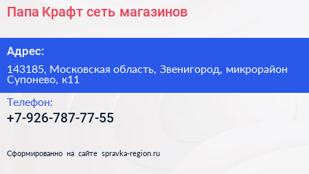 Папа Крафт, сеть магазинов по адресу 143185, Московская область, Звенигород, микрорайон Супонево, к11 в дальнейшем Организация, размещена в следующих категориях: