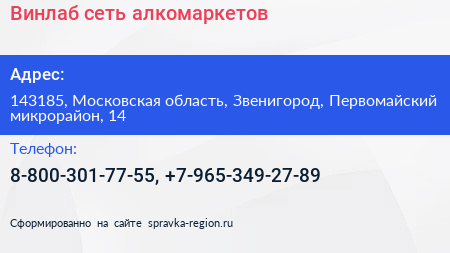 Винлаб, сеть алкомаркетов по адресу 143185, Московская область, Звенигород, Первомайский микрорайон, 14 в дальнейшем Организация, размещена в следующих категориях: