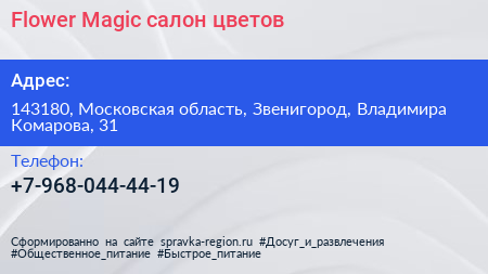 Flower Magic, салон цветов по адресу 143180, Московская область, Звенигород, Владимира Комарова, 31 в дальнейшем Организация, размещена в следующих категориях: