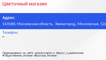 Цветочный магазин по адресу 143180, Московская область, Звенигород, Московская, 12а в дальнейшем Организация, размещена в следующих категориях: