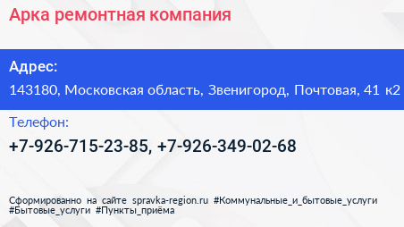 Арка, ремонтная компания по адресу 143180, Московская область, Звенигород, Почтовая, 41 к2 в дальнейшем Организация, размещена в следующих категориях: