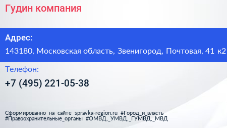 Гудин, компания по адресу 143180, Московская область, Звенигород, Почтовая, 41 к2 в дальнейшем Организация, размещена в следующих категориях:
