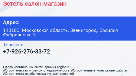 Эстель, салон-магазин по адресу 143180, Московская область, Звенигород, Василия Фабричнова, 3 в дальнейшем Организация, размещена в следующих категориях: